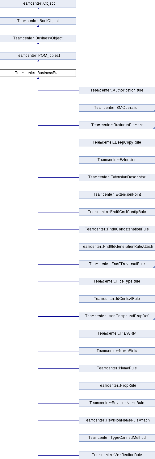 Reimplemented in Teamcenter::IRDC, Teamcenter::DispatcherServiceConfig, Teamcenter::PrintConfiguration, Teamcenter::RevisionNameRule, Teamcenter::SystemStampConfiguration, Teamcenter::FunctionalityRule, Teamcenter::VerificationRule, Teamcenter::RevisionNameRuleAttach, Teamcenter::DeepCopyRule, Teamcenter::Fnd0ConcatenationRule, Teamcenter::NameField, Teamcenter::Fnd0IdGenerationRuleAttach, Teamcenter::BMOperation, Teamcenter::Extension, Teamcenter::ExtensionDescriptor, Teamcenter::ExtensionPoint, Teamcenter::PropertyBMOperation, Teamcenter::TypeBMOperation, Teamcenter::ImanGRM, Teamcenter::Fnd0IncludedLODef, Teamcenter::Fnd0LOCompoundPropDef, Teamcenter::ImanCompoundPropDef, Teamcenter::NameRule, Teamcenter::PropRule, Teamcenter::AppExtensionPoint, Teamcenter::AppExtensionRule, Teamcenter::AppExtensionRuleType, Teamcenter::BusinessContext, Teamcenter::BusinessElement, Teamcenter::DecisionTable, Teamcenter::RBFCell, Teamcenter::RBFExpression, Teamcenter::RBFInput, Teamcenter::RBFOutput, Teamcenter::RBFParamDef, Teamcenter::RBFRow, Teamcenter::RBFTableColumn, Teamcenter::AuthorizationRule, Teamcenter::Fnd0PropagationRule, Teamcenter::Fnd0TraversalRule, Teamcenter::HideTypeRule, Teamcenter::IdContextRule, Teamcenter::TypeCannedMethod, and Teamcenter::Fnd0CmdConfigRule.